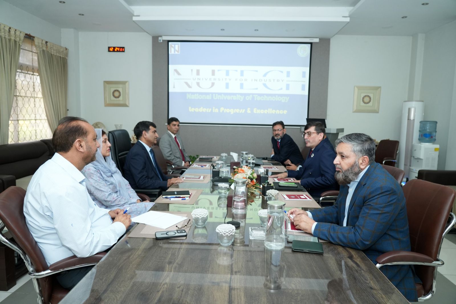 A three-member delegation of AJK TEVTA led by the Chairman, visited NUTECH to explore strategic collaboration in technical and vocational education and training. The delegation was briefed on NUTECH’s skills development initiatives, industry-aligned curriculum and modern infrastructure. The Chairman appreciated the University’s role in promoting skill-based education and developing a workforce aligned with market needs. Both sides discussed potential areas of cooperation, including professional development courses, curriculum development, joint training initiatives and affiliations of AJK TVET Institutes with NUTECH. Later, the delegation also visited NUTECH’s laboratories, the Skills and Development Department (NSDD), Innovation Center (NIC) and Entrepreneur and Incubation Centre (NEIC), where ongoing projects were showcased.
